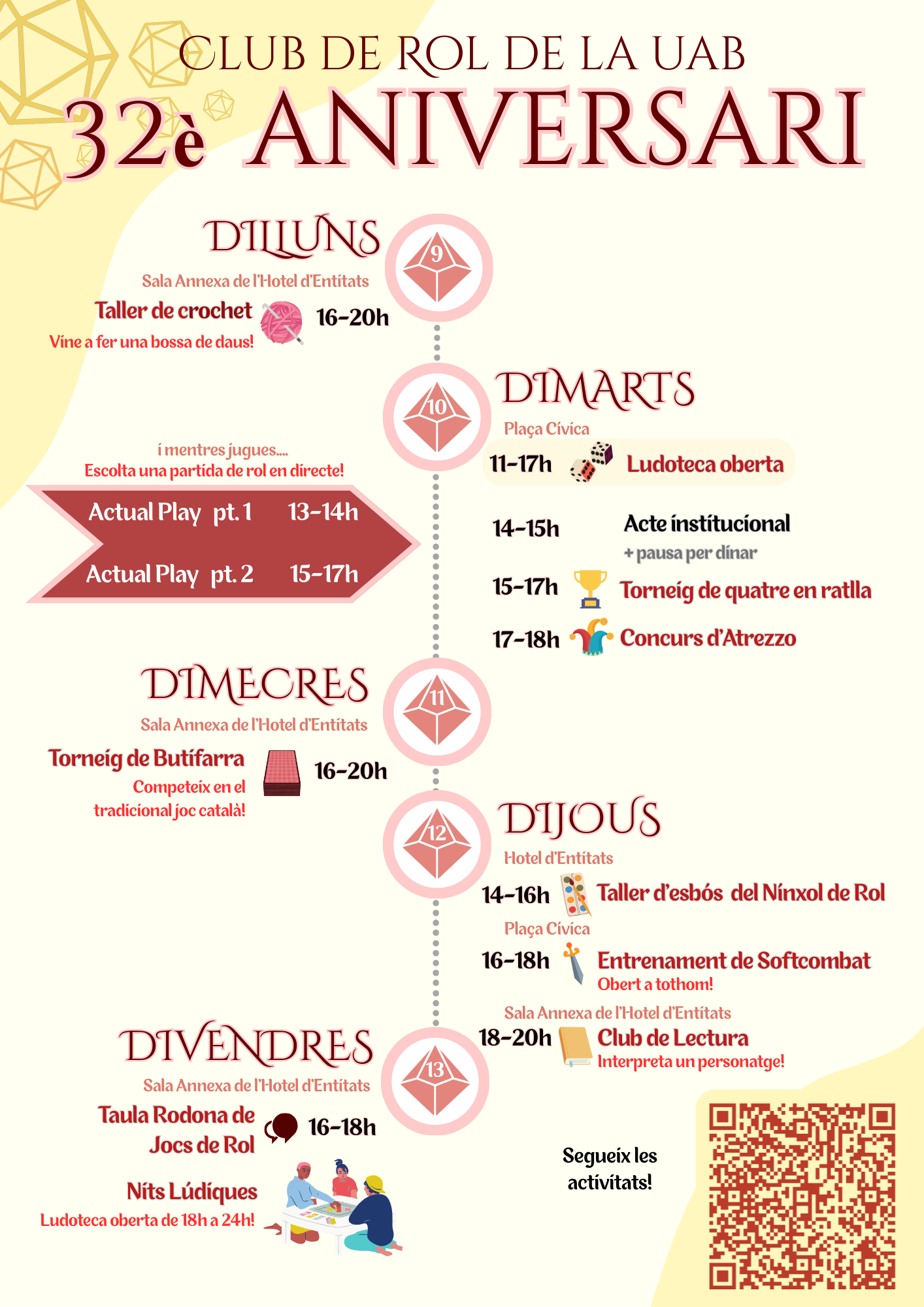 Aquest any tenim preparada tota una setmana plena d'activitats en conjunt amb altres col·lectius i associacions de la UAB: Tallers de crochet per fer la teva pròpia bossa de daus, ludoteques obertes al públic, tornejos, partides de rol, concursos d'atrezzo, entrenaments de softcombat, tallers de lectura, i molt més!